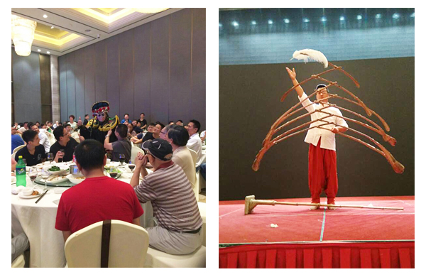 晚宴聯(lián)誼現(xiàn)場,杭州易龍藝術(shù)團擔綱整臺演出,樂器彈唱、川劇變臉、喜劇達人、魔術(shù)等節(jié)目得到同行的熱烈反響與互動,現(xiàn)場的氛圍一浪高過一浪,直到散場音樂結(jié)束,同行們才緩緩離場。給我們的大彩蛋就是,建筑電氣的領(lǐng)導(dǎo)還專程過來后臺表示慰問。觀眾的熱烈反響是易龍藝術(shù)團不斷進步的鼓勵,領(lǐng)導(dǎo)和同行的認同與贊美是對易龍防雷行經(jīng)在建筑電氣安防行業(yè)中的動力,2017我們一直在路上!
